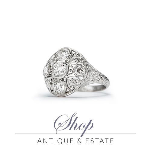 As romantic as a ring can be, Diamond Bow is a genuine antique platinum filigree ring featuring Old European cut diamonds. Centering the ring is an Old European diamond 1.65ct...